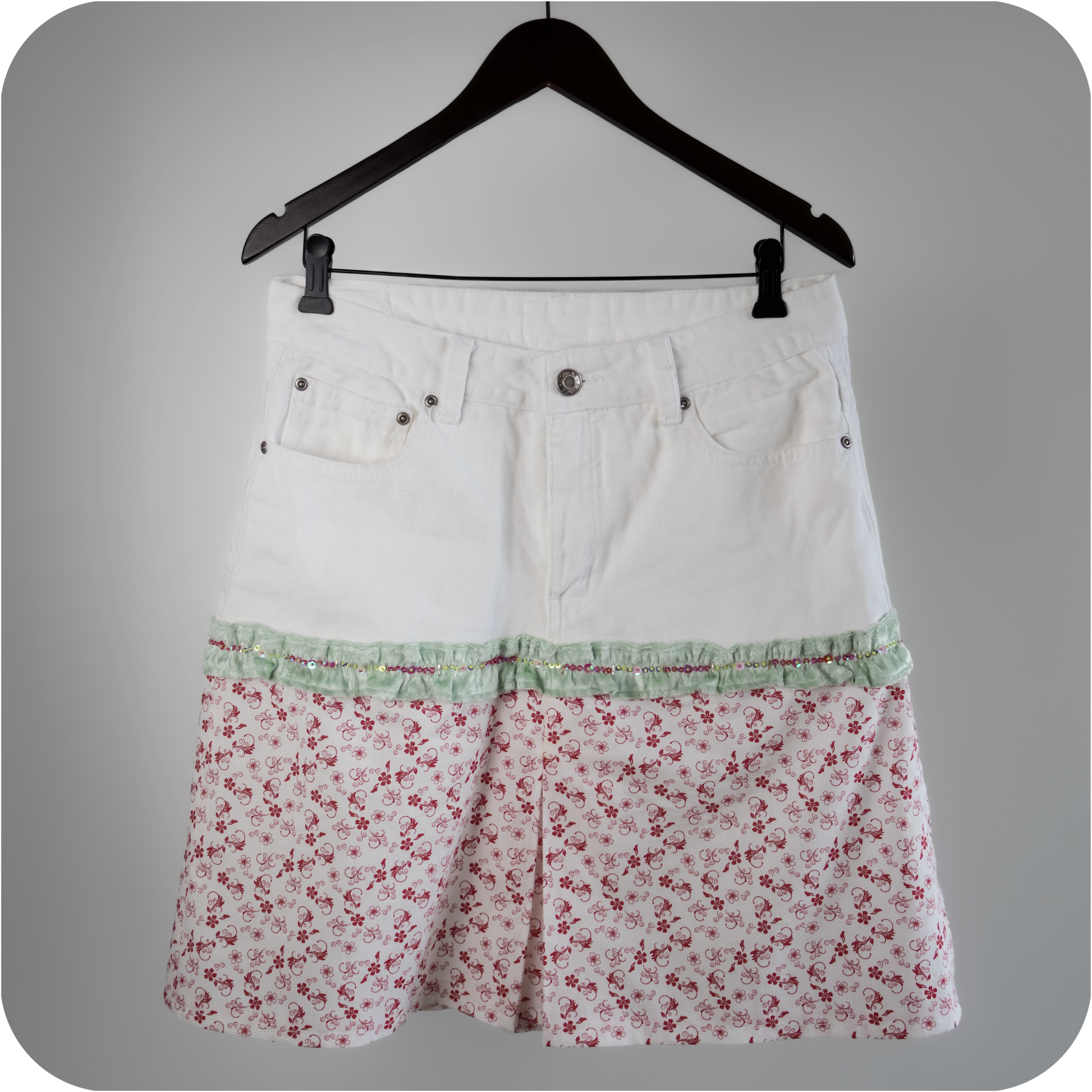 High-waisted mini skirt made from rescued denim, reworked with cotton floral fabric and featuring structured front and back box pleats and pockets and a soft velvety hand-beaded ruffle.